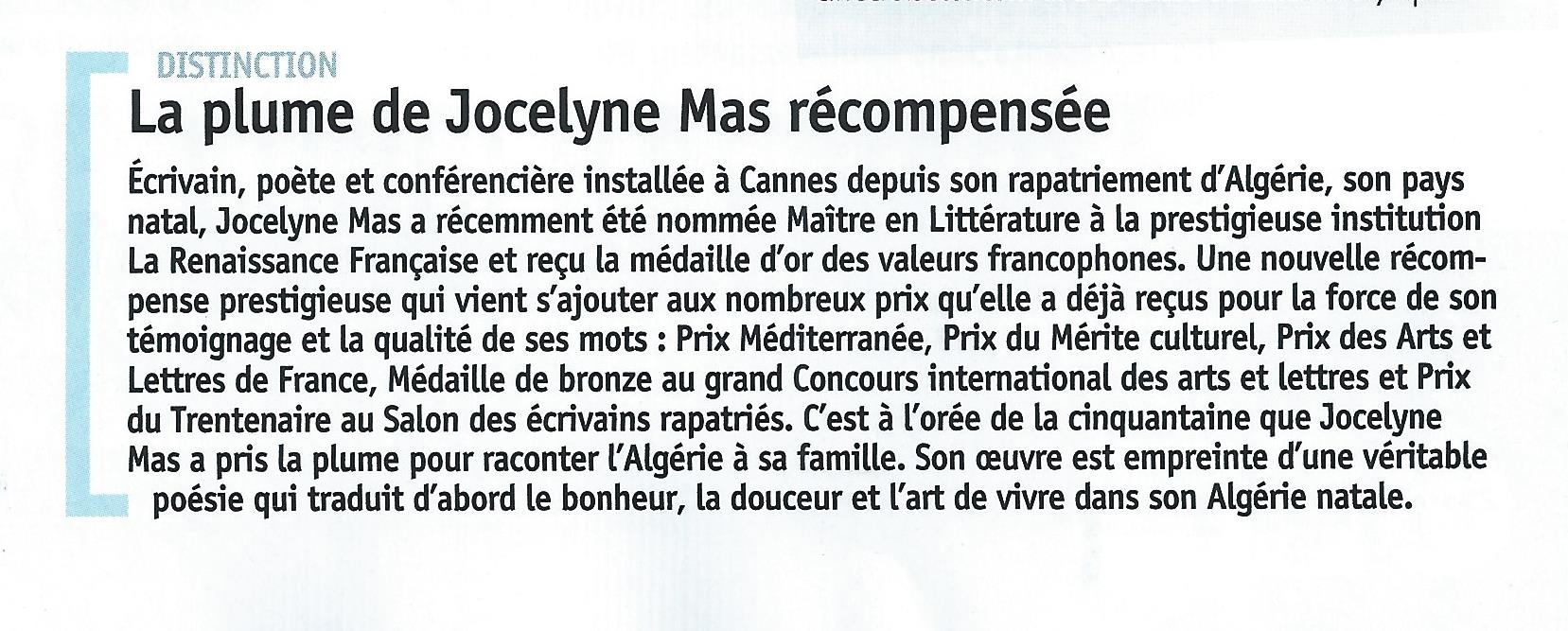 Toutes mes sincères félicitations chère Jocelyne : récompense méritée qui fait honneur au parcours de si nombreux rapatriés et bien évidemment à votre famille qui a su vous éduquer dans nos belles valeurs républicaines qui ont été bien oubliées depuis.