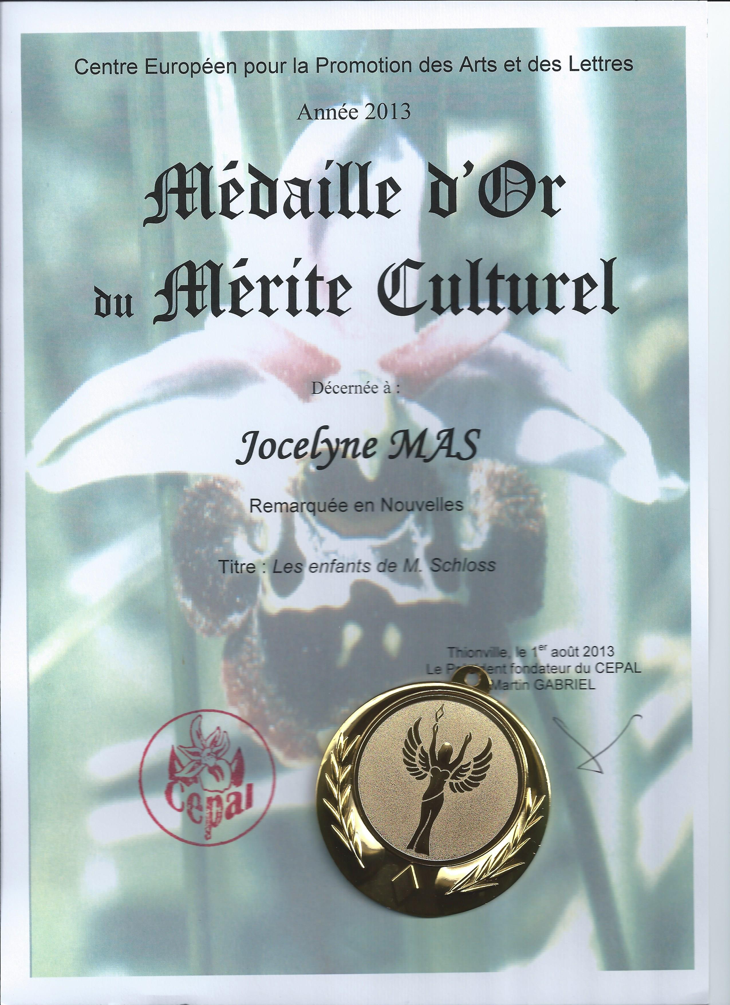 Médaille d'Or remise à Maître Jocelyne MAS sous la présidence de Madame Simone VEIL de l'Académie Française, du Président International Denis FADDA de l'Académie des Sciences d'Outre-Mer le 6 novembre 2015 à Paris.